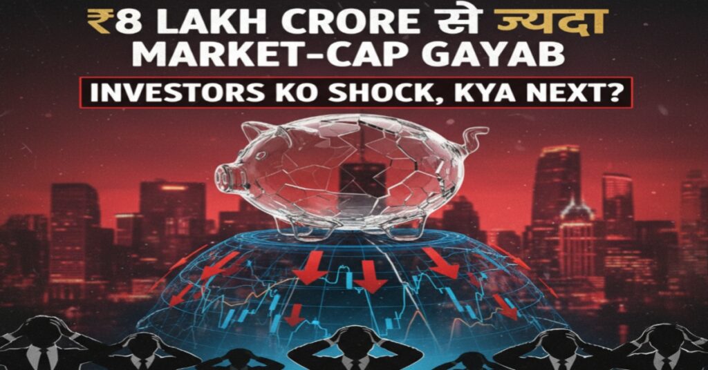 Indian stock market me recent sessions ne investors ko bada jhatka diya hai. Sirf kuch hi dino me ₹8 lakh crore se zyada market capitalization wipe-out ho gaya, jisse Sensex–Nifty dono par heavy pressure dikhne laga. Jab itni badi value market se ek saath gayab hoti hai, to naturally investors ke mind me tension badh jaati hai. Ab sabka ek hi sawaal hai — aage kya hone wala hai?