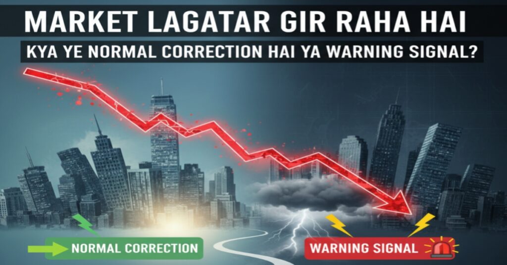 Indian stock market me pichhle kuch sessions se lagatar girawat dekhne ko mil rahi hai. Sensex aur Nifty dono hi pressure me hain, aur har din ke close ke baad investors ka concern thoda aur badhta ja raha hai. Jab market continuous red days dikhata hai, to naturally ek hi sawaal dimag me aata hai — kya ye sirf ek normal correction hai ya phir koi warning signal?